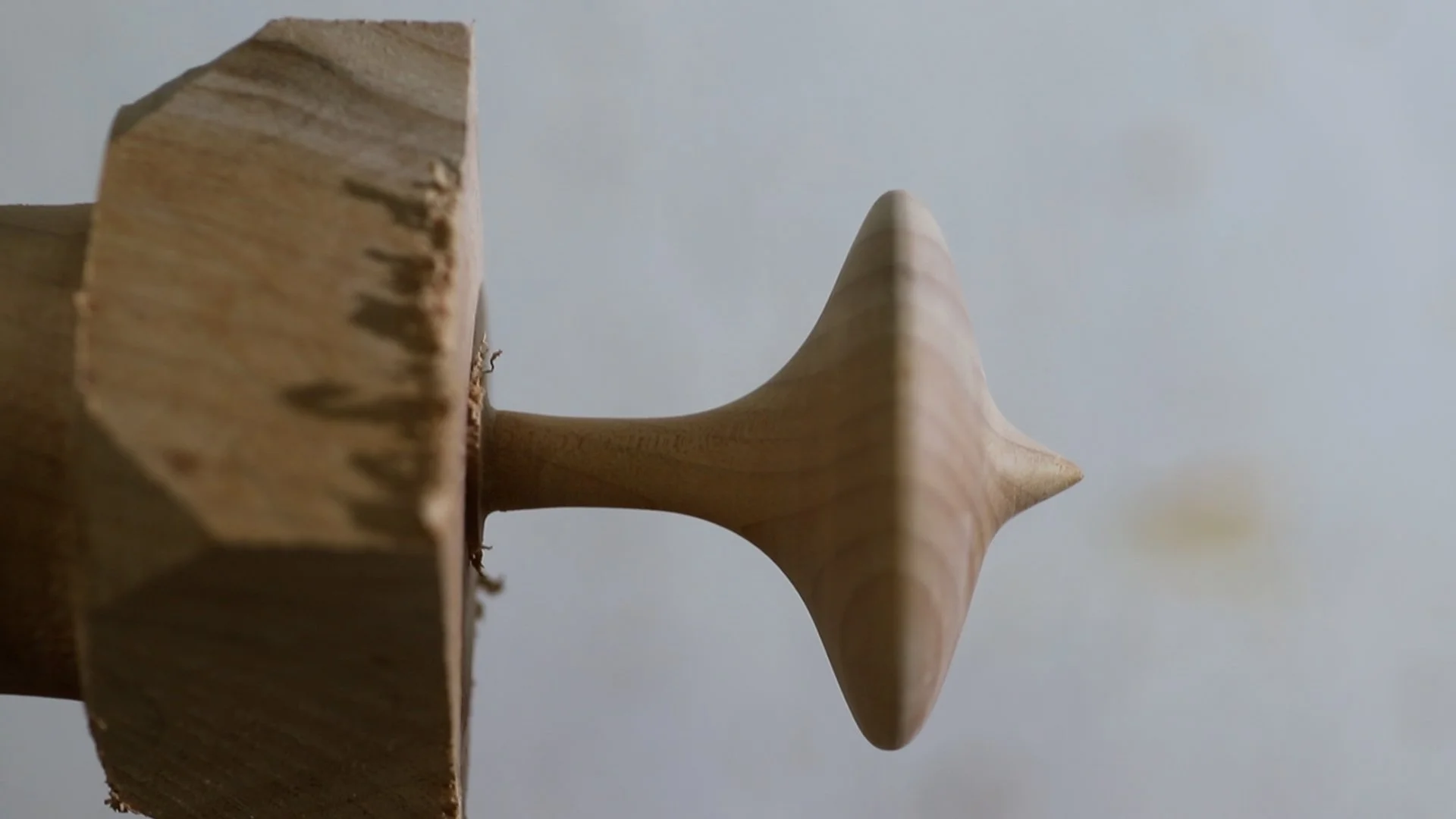 In terms of making these, at first it started with using primarily the CNC. However, while the rotary is great for a lot of things, the one thing it doesn't do is spin really fast like a traditional lathe. So when it became time to shape the top that you hold on to (which can't really be cut too much on the CNC because then it breaks), we went through different options. My first idea was to simply hand carve each one by hand, however it's hard to get a very clean look and they're not consistent either. Next up we mounted each top in the drill in order to spin it to sand it and try to shape it. In the end we realized, the traditional lathe would probably be the best choice here. Now the lathe is great because you can mount the top very securely in the chuck, and you have a lot of control when sanding and shaping.
